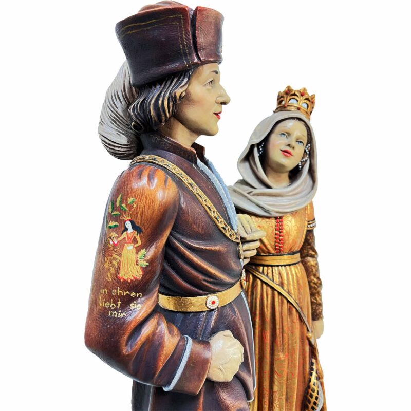Die Holzskulptur des renommierten Bildhauers Piccolruaz aus dem Jahr 1989 besticht durch ihre kunstvolle Handwerkskunst und ihre präzise Ausführung. Jedes Detail, von den königlichen Gewändern bis hin zu den feinen Gesichtszügen, wurde mit großer Sorgfalt gestaltet, um eine lebendige und authentische Wiedergabe des Landshuter Fürstenpaares zu erreichen.