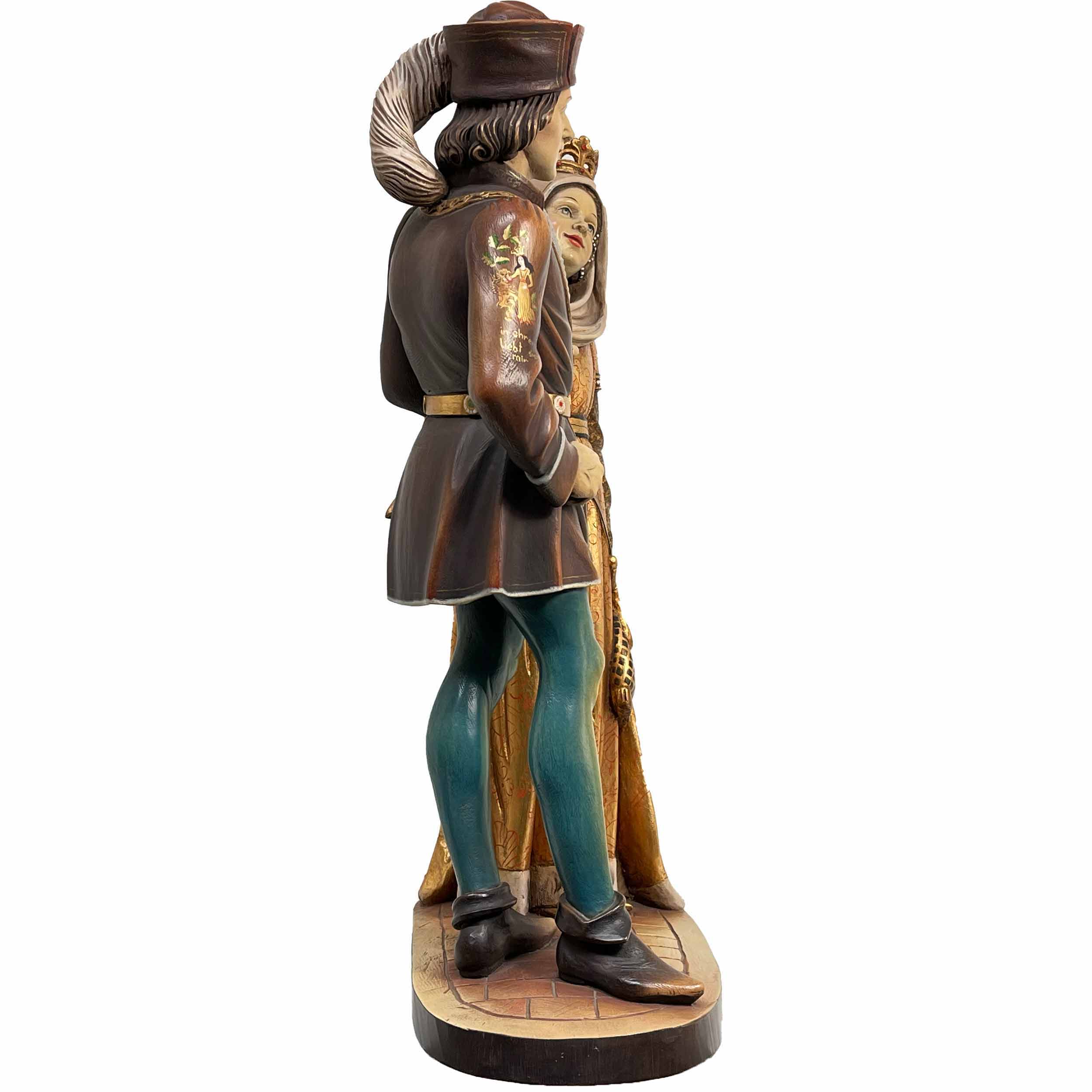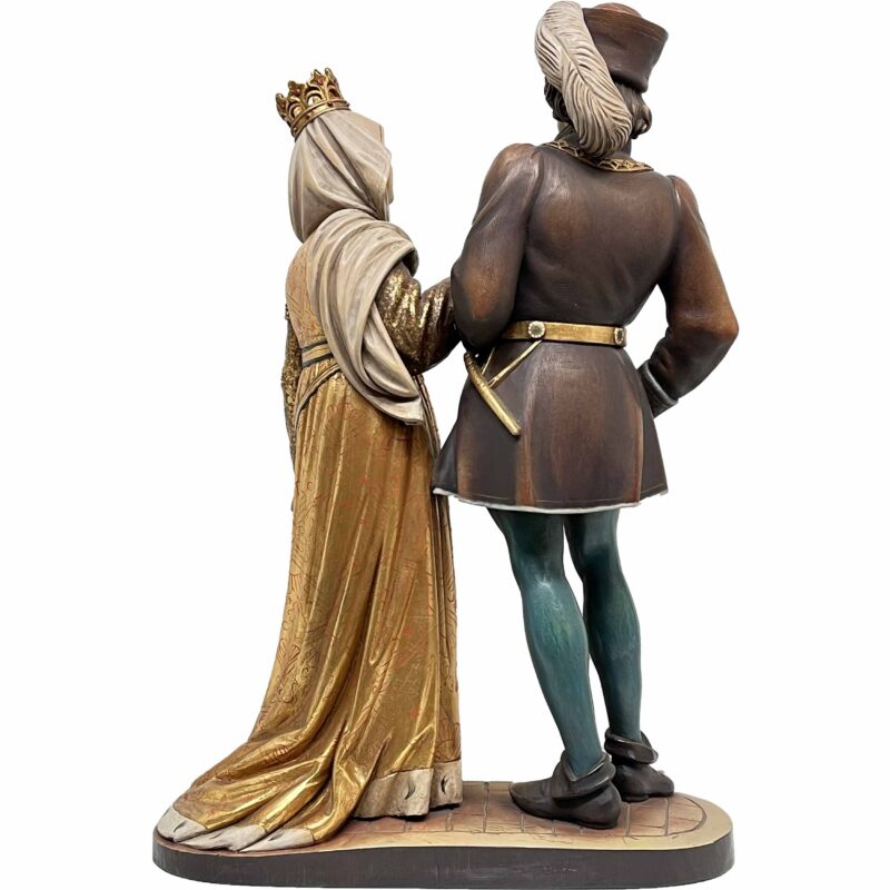 Was diese Holzskulptur wirklich auszeichnet, sind die verschiedenen Maltechniken, die verwendet wurden, um jedem Detail Lebendigkeit zu verleihen. Von der realistischen Farbgebung der Gewänder bis hin zu den kunstvollen Schattierungen im Gesicht des Fürstenpaares – diese Maltechniken schaffen ein außergewöhnliches visuelles Erlebnis, das die Betrachter fasziniert.